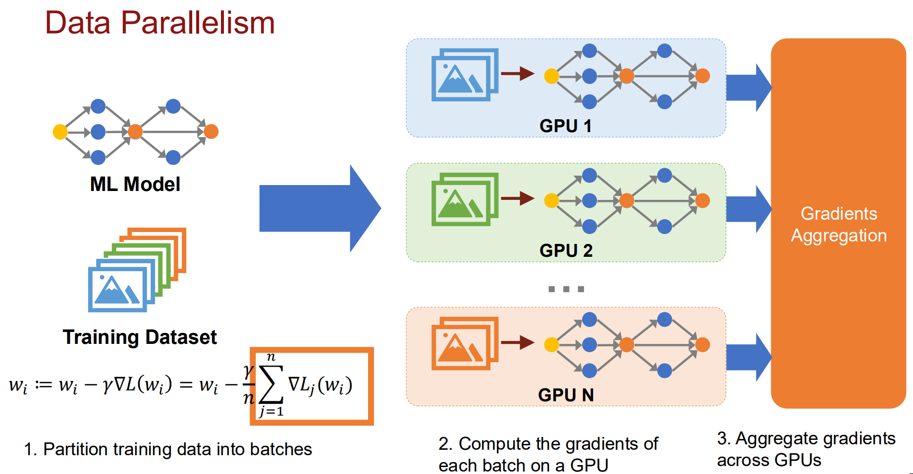 训练本质上是计算梯度并更新权重。数据并行直观理解就是如果有 $ N $ 个 GPU,那么把总的 Batch Size 分成 $ N $ 份。