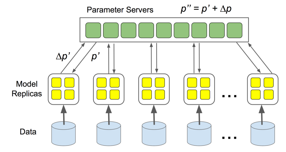 早期的实现方案是使用一个 Parameter Server,当 Server 接收到所有人的梯度以后再汇总更新。但是这样当 GPU 数量增多时,中心服务器的带宽就会出现不足,从而导致无法扩展。