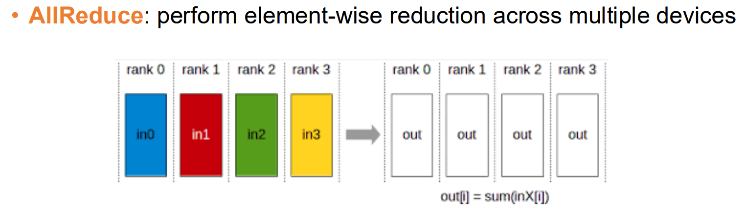 - All-Reduce:计算全局平均梯度 $$ \bar{g} = \frac{1}{N} \sum_{k=1}^{N} g^{(k)} $$