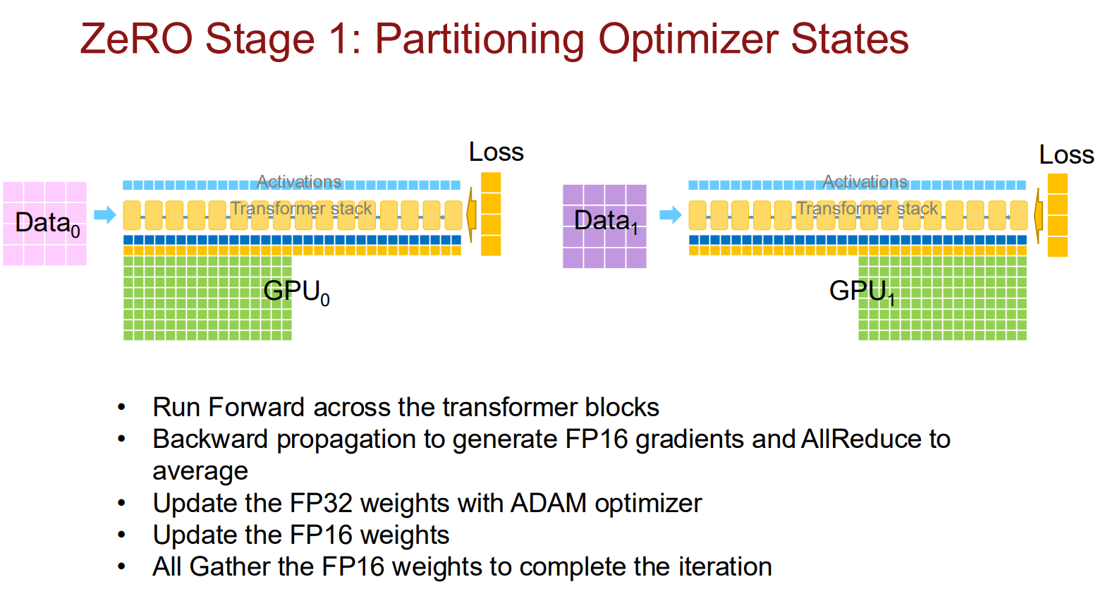 - 通信:通信量没有增加。原本的 Ring AllReduce 分为 Scatter-Reduce + All-Gather 两个阶段。ZeRO Stage 1 只是把这两个阶段拆开了,先做 Scatter-Reduce 拿到梯度,更新完参数后,再做 All-Gather。总量依然是 $ 2 \times M $。