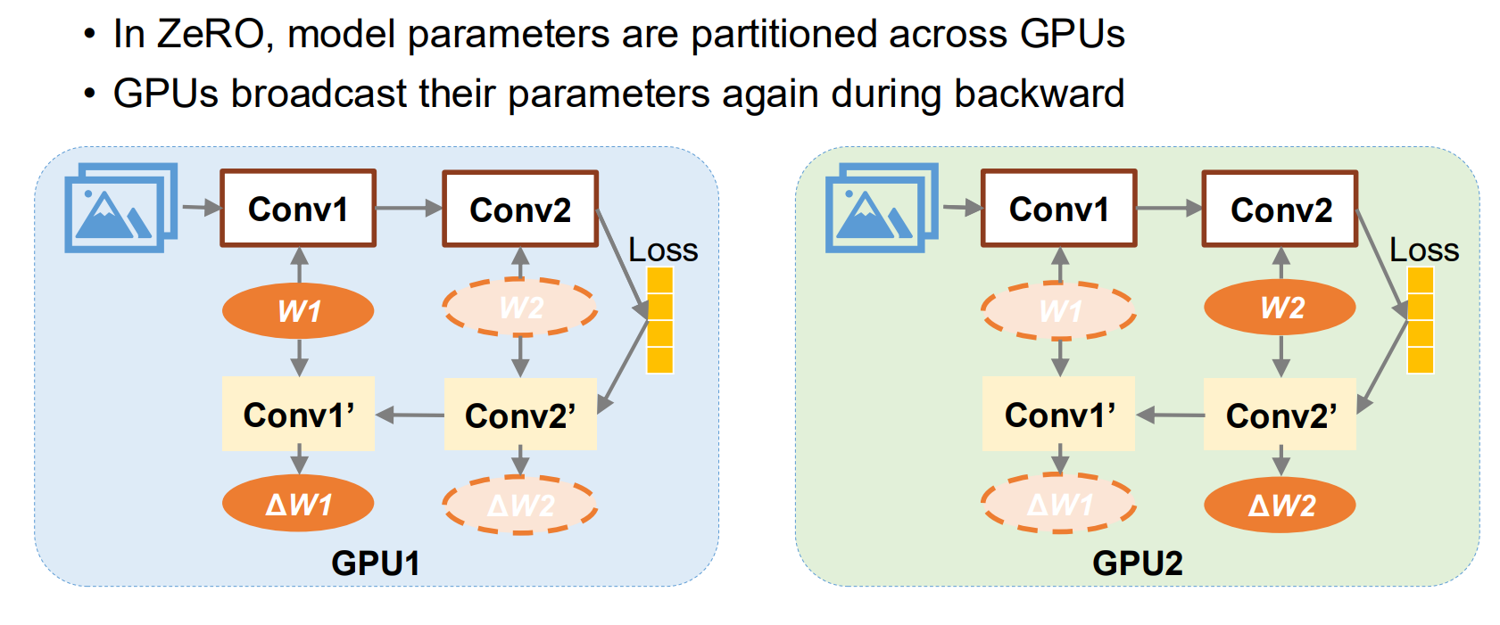 - 反向传播时同理。要算 Conv2 的梯度,再次 All-Gather 拼出完整的 Conv2 参数,算完梯度后再次扔掉。