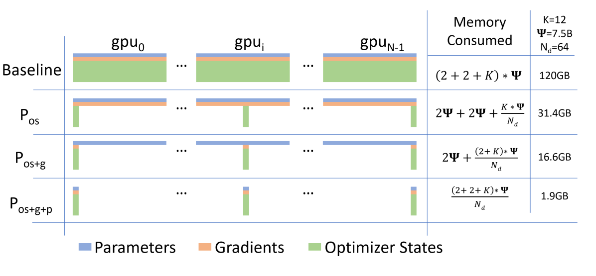 虽然通信问题得到了解决,但是随着模型参数量逐渐加大,单卡的显存也成为了瓶颈。传统数据并行方案中每张卡都要存储完整的模型和状态,随着参数量增大,不可能跑得动大模型。