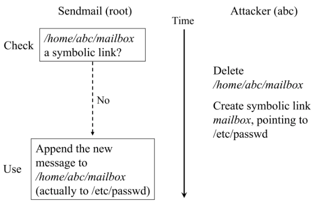 攻击者在 check 之后马上替换文件为符号链接,就可以造成权限问题等严重安全漏洞