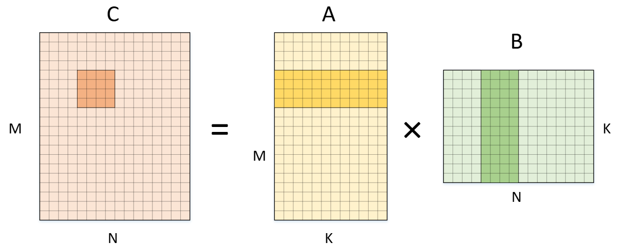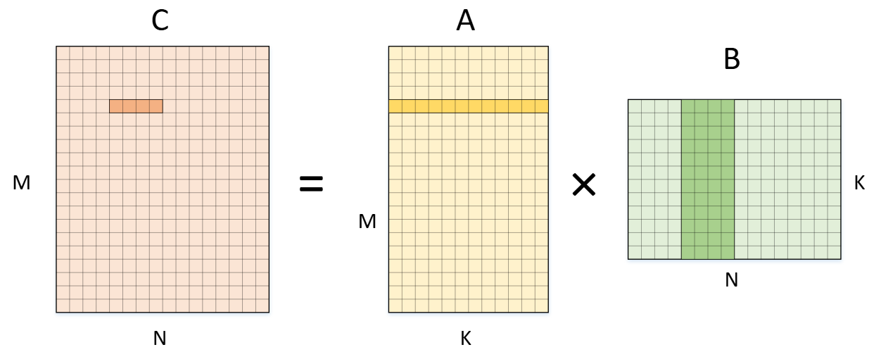GEMM 通常定义为 $ C = A \times B $,对于矩阵 $ A \in \mathbb{R}^{M \times K} $,矩阵 $ B \in \mathbb{R}^{K \times N} $,其乘积矩阵 $ C\in \mathbb{R}^{M \times N} $ 可以表示为